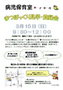 保育がお休みなため、保育室をゆっくり見学していただけます。       病児保育の利用方法など個別対応でご案内いたします。           新年度に向けて、病児保育がどんなところかなど気になる方は、ぜひこの機会にお越しください。                            予約制のため、事前申し込み(06-6656-6105まで)をお願いします。     登録希望の方は母子手帳と保険証をお持ちください。